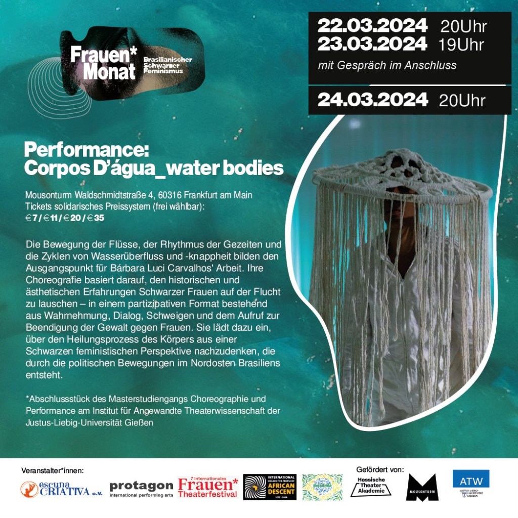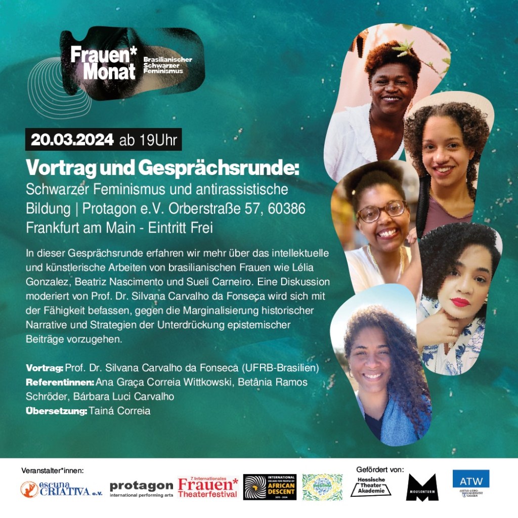 March is the month to raise awareness of womxn’s struggle for equal rights in society and art. We will facilitate a week full of activities aimed at disseminating black Brazilian feminism in Frankfurt am Main. Among the guests are Professor Silvana, Ph.D. in literature and gender, sociologists Ana Graça Correia Wittkowski, Betânia Ramos Schröder, and Bárbara Luci Carvalho, a member of our team who is finishing her master’s degree in choreography and performance at Gießen University. Check out the program in German, English, and Portuguese.